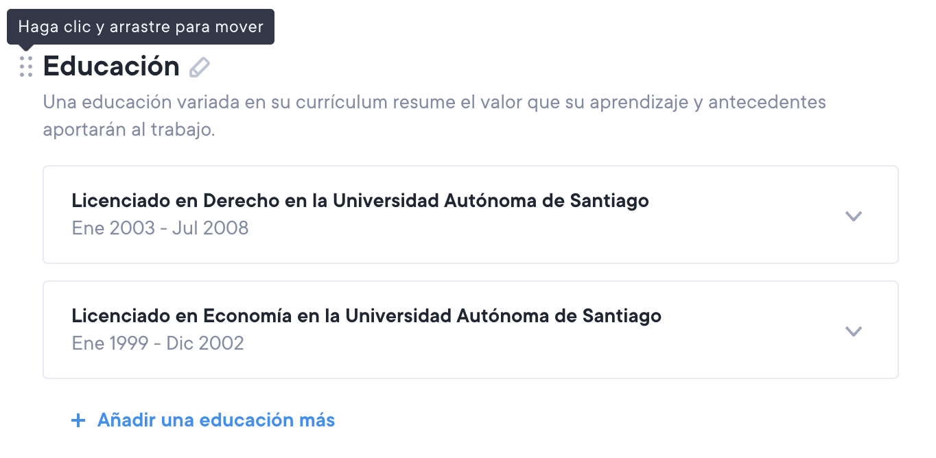 Reordenar secciones*: Cada sección abajo indicada del Currículum profesional en la columna principal puede ser reordenada. Para volver a ordenar una sección, haz clic en el icono de cuadrícula a la izquierda de la sección como se ve a continuación. A continuación, puedes arrastrar las secciones hacia arriba o hacia abajo. Mira las capturas de pantalla a continuación.