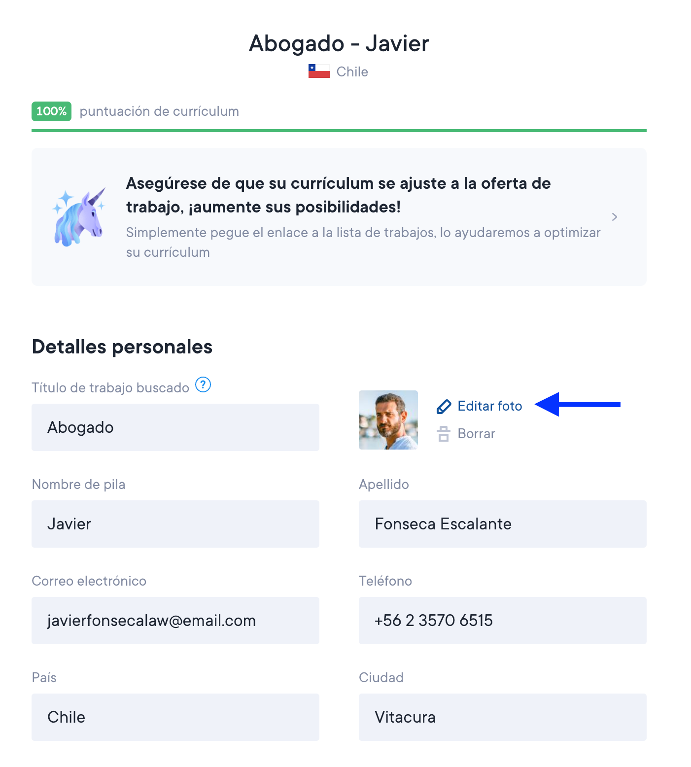 Para agregar una foto a tu currículum, inicia sesión en tu cuenta y haz clic en Editar tu currículum. Desde allí, haz clic en la primera sección llamada Datos personales.