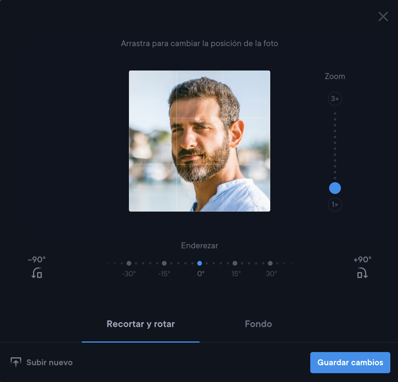 Una vez que subas tu foto a un currículum por primera vez, estará disponible para usar en plantillas y diferentes versiones de tu currículum. Puedes ajustar la imagen y cambiar y eliminar fondos. Siempre puedes eliminar tu foto del editor de currículum o cargar una nueva foto en cualquier momento.